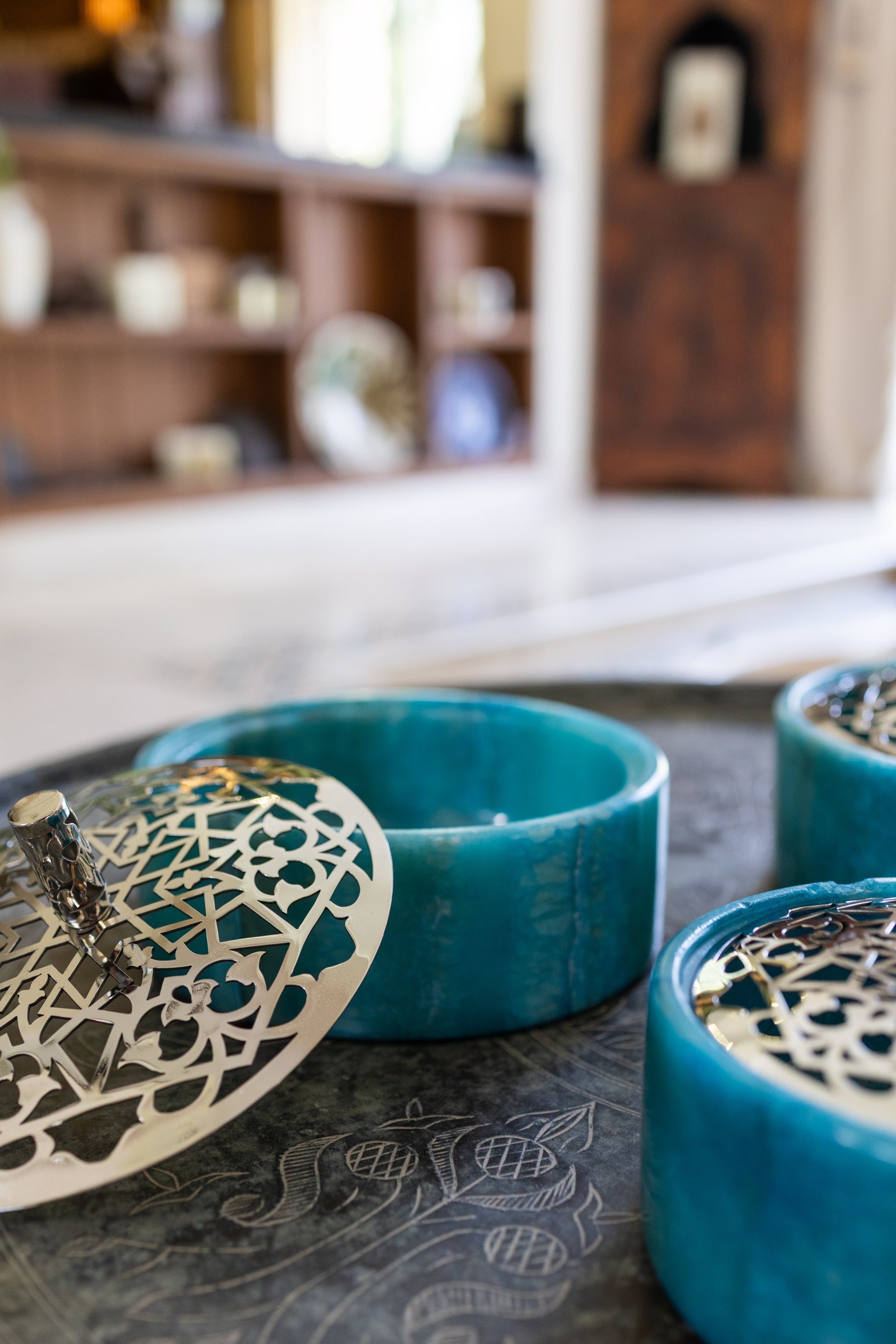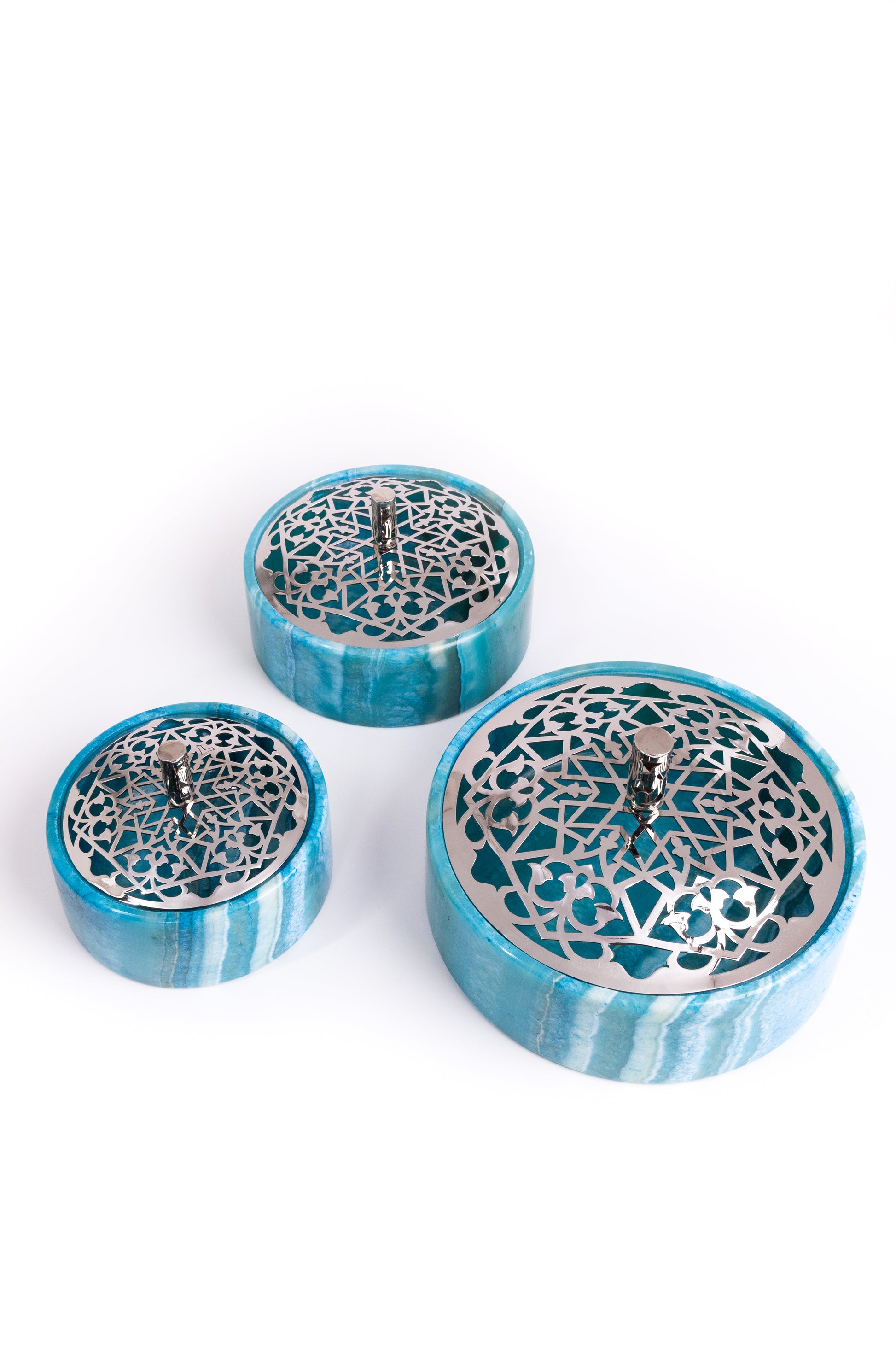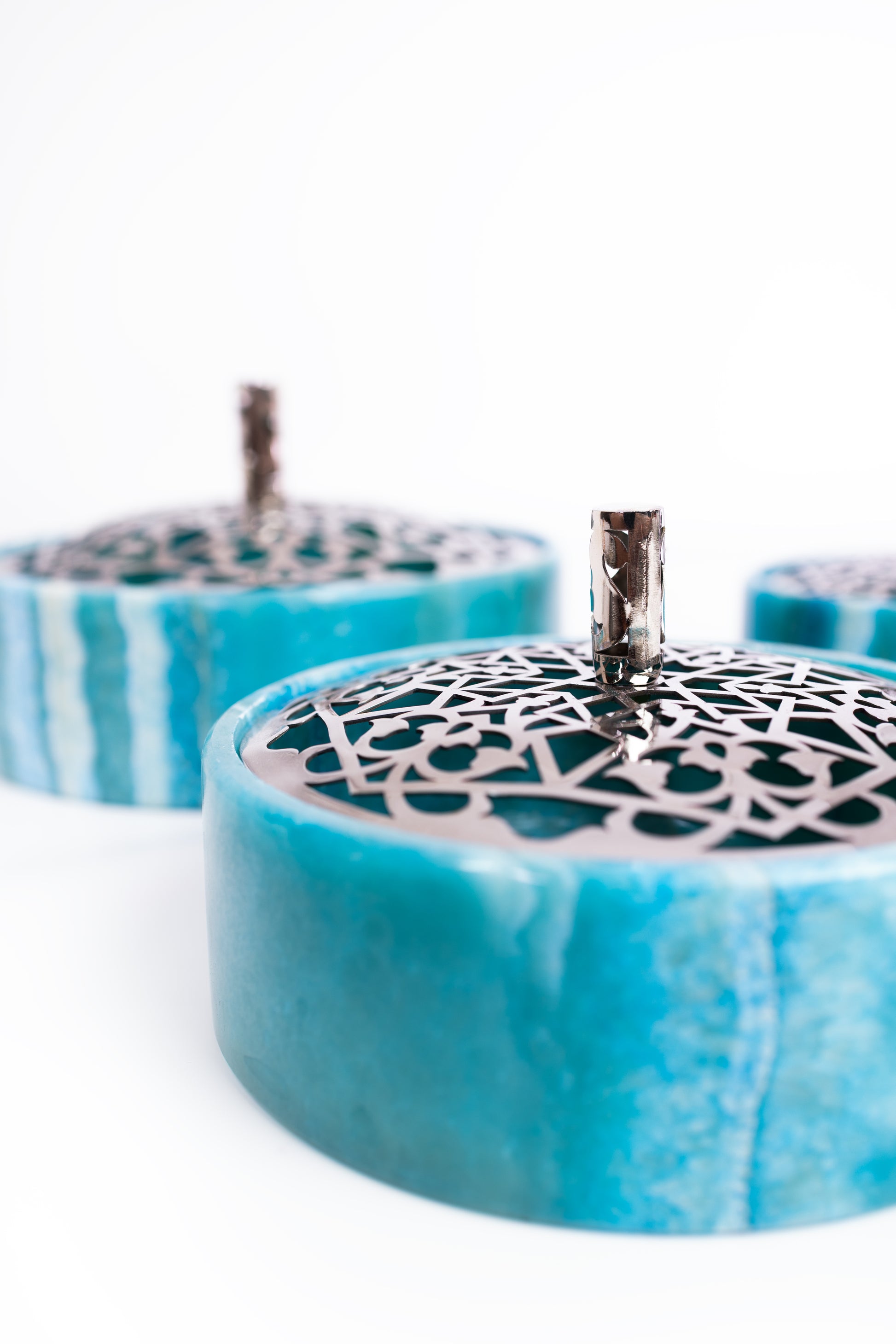 Shaped from cool turquoise alabaster, this jar reflects a different rhythm. Precision replaces movement as geometric motifs unfold with calm order. The surface feels deliberate, structured, and serene.